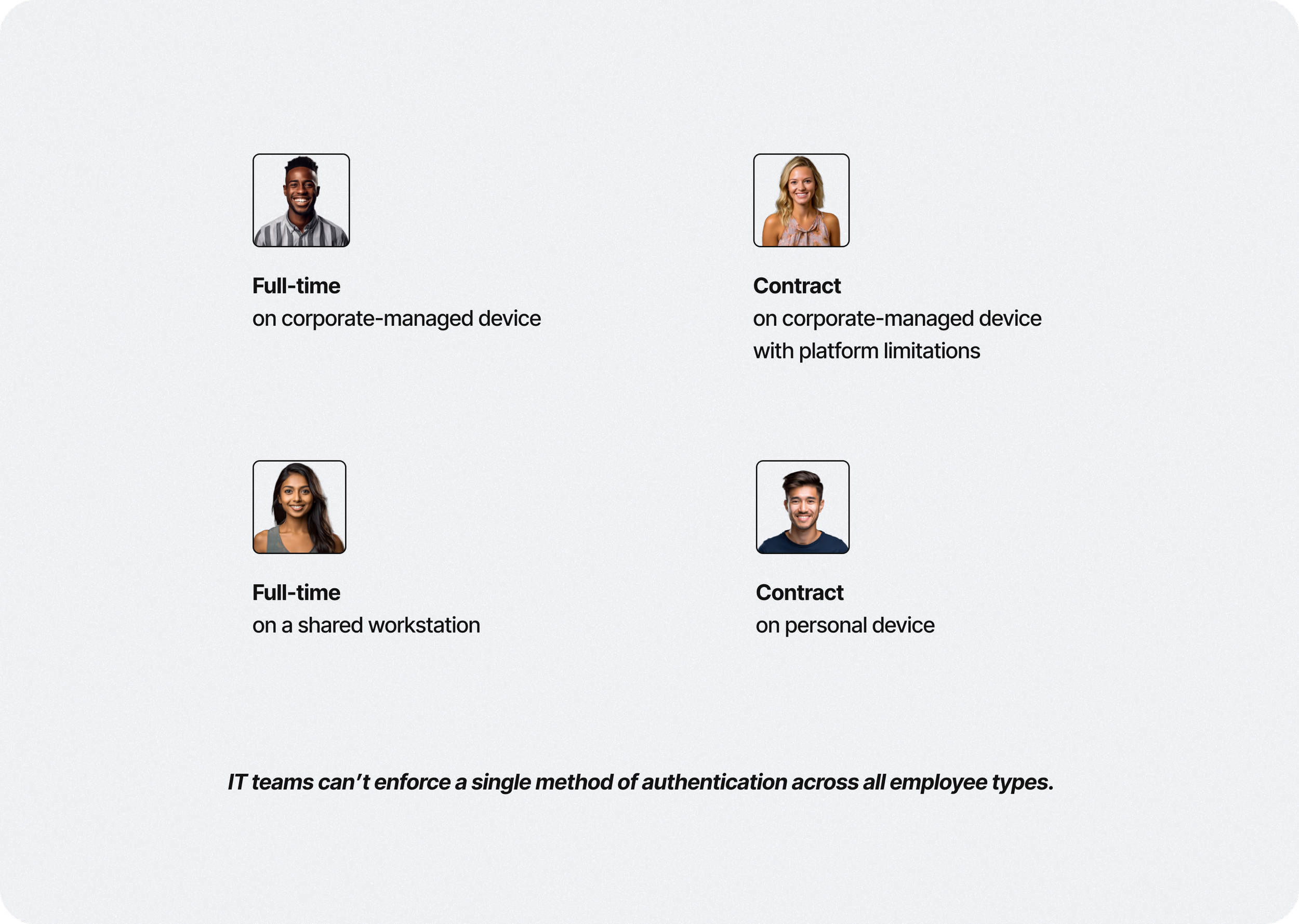 Different employees authenticated in different ways depending on their status (full-time/contractor), type of device, type of resource they’re accessing, and personal preference.